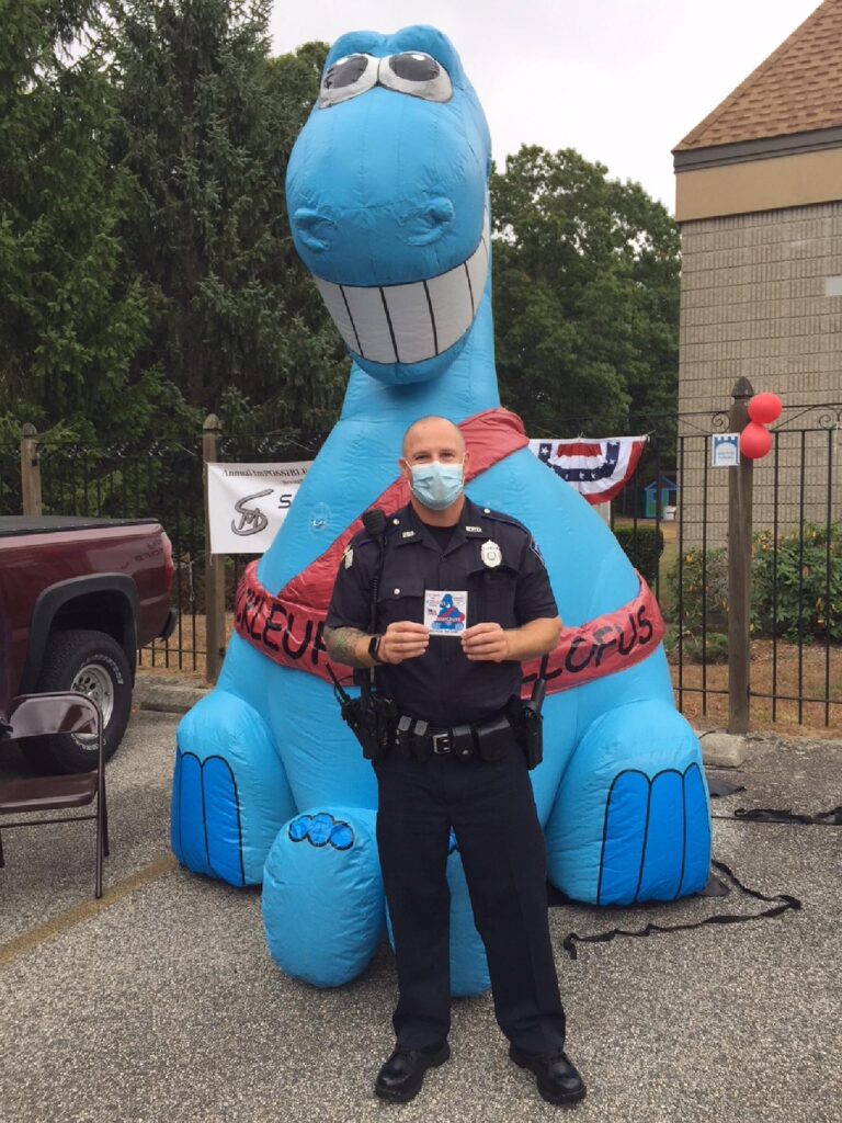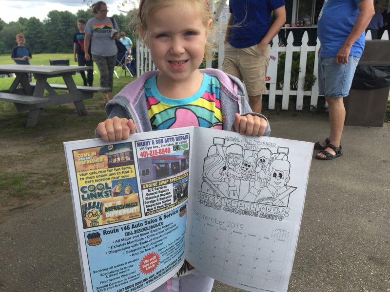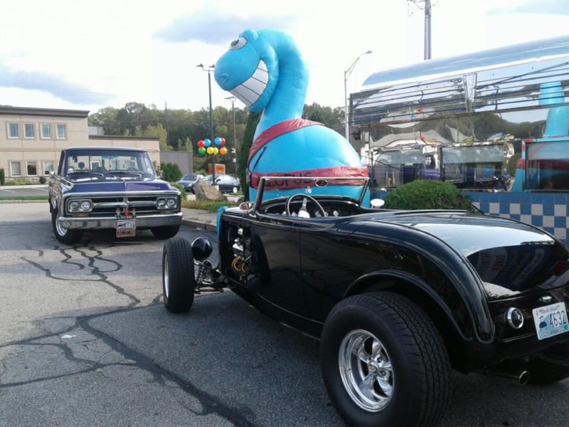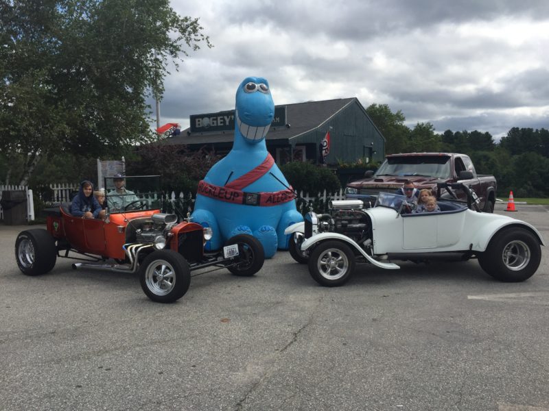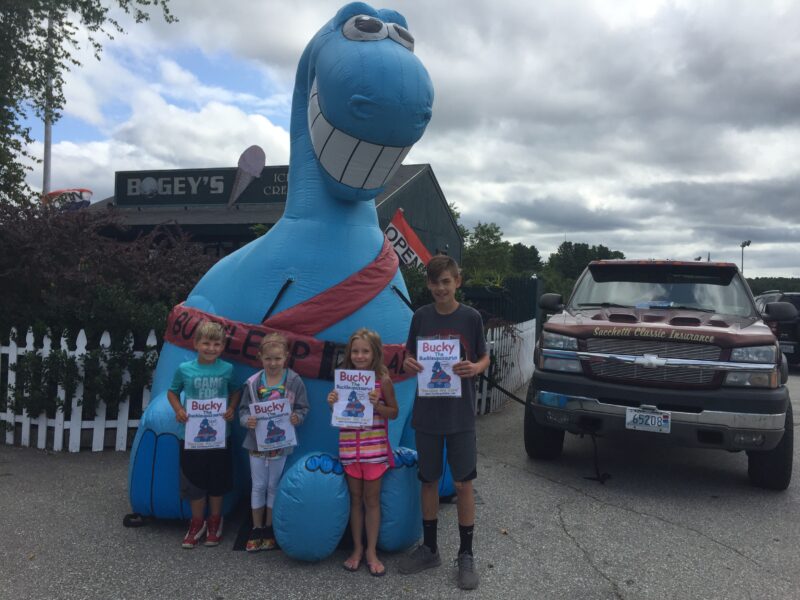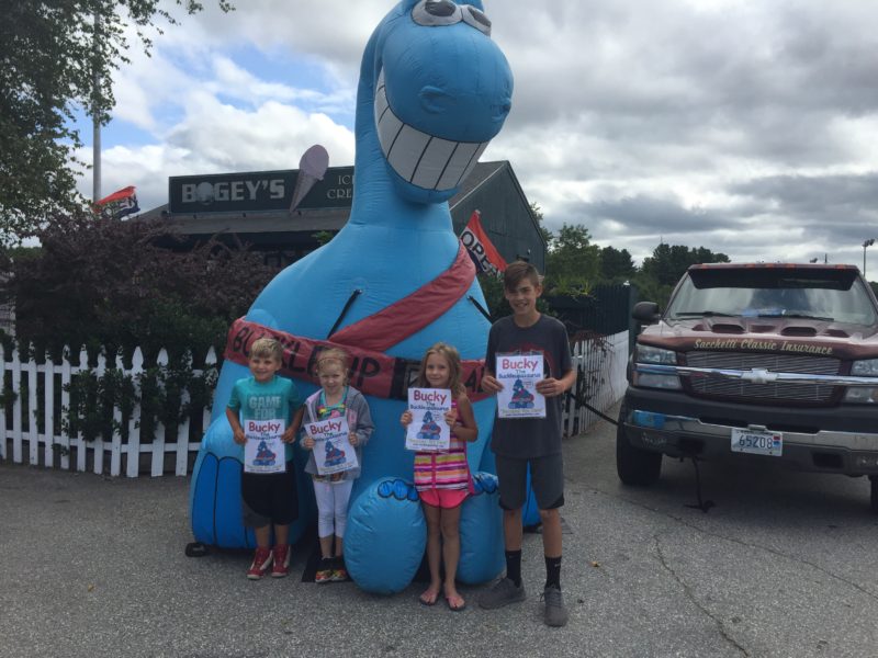 Buckleupallofus Cruisin’ For Safety Written by Jim Weicherding / Bucky is quickly becoming the most requested Showcase Attraction at Classic Car Shows & Cruise Nights Across New England. This big blue dinosaur with a big smile and a seatbelt for a tail has appeared at nearly 300 Classic Car Shows, Cruise Nights, Community Events, Race Tracks, DragWays, Plazas, Malls and Auto Dealerships since it first arrived in the state of Rhode Island just 24 Months Ago. Classic Car Shows and Cruise Nights are the most popular attraction venues but that’s because the creator of Buckleupallofus is a long time automotive enthusiast himself. Second most popular venues are Race Tracks and DragWays Events. The creator of Buckleupallofus is also a huge racing and drag racing enthusiast. And again, these venues and events also makes perfect sense for Showcasing the Giant Buckleupallofus Child Passenger Safety Mascot Balloon and passing out Child Safety Materials Like Fridge Magnets, Stickers, Book Page Savers, Coloring Posters, Coloring Books and Bucky Kids Safety Fun Paks to Kids; it’s all about automotive featured venues and events. There are automobiles everywhere and there are kids everywhere. These photos were taken recently at a huge Car Cruise Hosted at Thompson Speedway Motorsports Park and adjacent Bogey’s Ice Cream located in Thompson Connecticut. Buckleupallofus Giant Balloon was so popular the owners of Thompson Speedway Motorsports Park asked if the Bucky Balloon could be showcased at their upcoming Kids & Family Appreciation Race Day on Sunday, September 8th, 2019. Of course, Bucky Giant Balloon will Showcase and we will be there to Pass Out 1,000’s Of Bucky Featured Print Items and Products during the Daylong Race Event For Kids to Take Home Reminding Them about Buckle Up! Boost Up! Car Seat and Traffic Safety. The month of September, is also recognized across the USA as National Child Passenger Safety Month. Bucky Giant Balloon will be Showcasing Across New England Reminding Kids About Buckle Up! and Traffic Safety all month long almost every single day of the month. You know you have something special when they create a Bucky Ice Cream Flavor For Kids too. And who doesn’t love Cotton Candy Flavored Ice Cream? Bucky sure does and he lets all of the Kids know it.