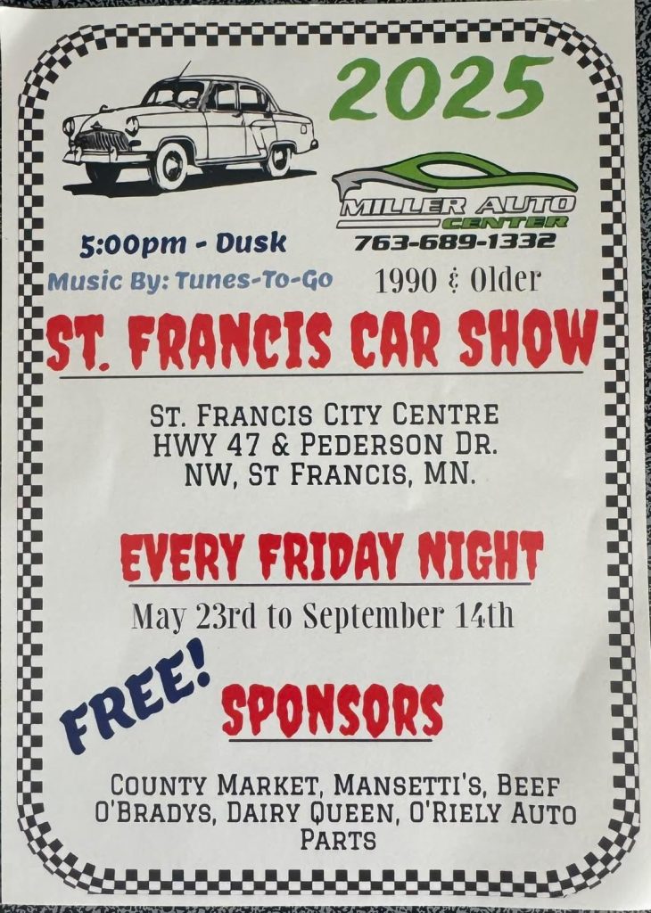 Where: County Market parking lot on Hwy 47 in St. Francis MN