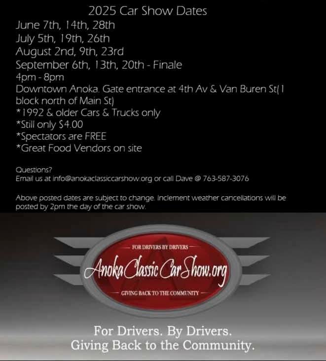 Questions? Email us at info@AnokaClassicCarShow.org or call Dave at (763) 587-3076